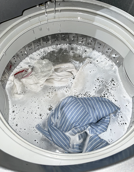 浸泡時,動動衣物,其實已經可以發現有些洗衣機內槽的污垢被分解下來了